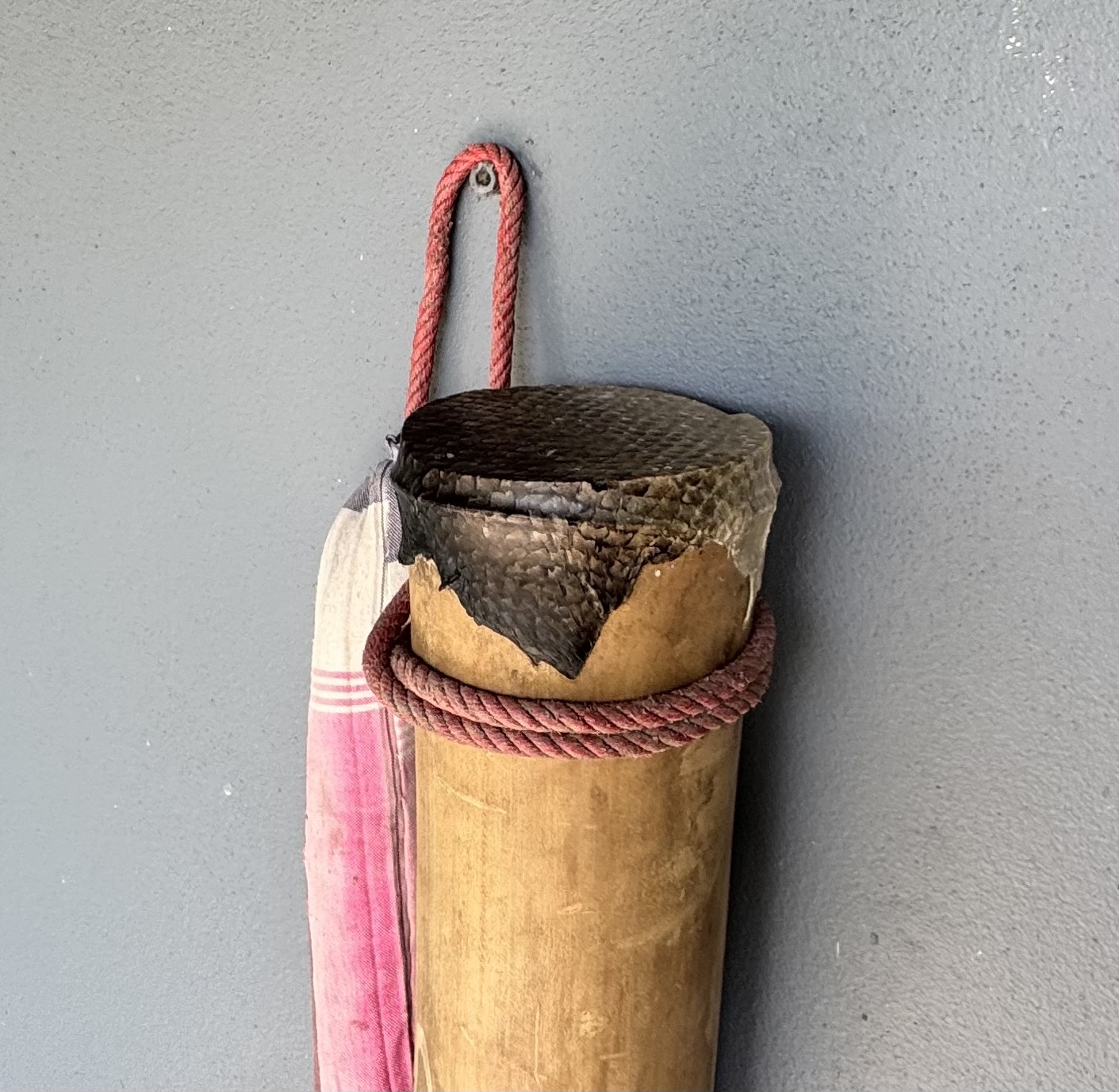 Baan Phue, Tambon Pandon, Amphoe Kumpawapi, Udonthani is very far away from the sea, especially the North Atlantic and North Pacific where salmon are found in nature. It is like a miracle to find massive salmon’s skin here. I wonder if the salmon is a transfiguration of another creature? Curiously, I use the skin to make a drum, together with the bamboo that Poh Nu Deang planted in his garden which is the same place I found this albino salmon.
